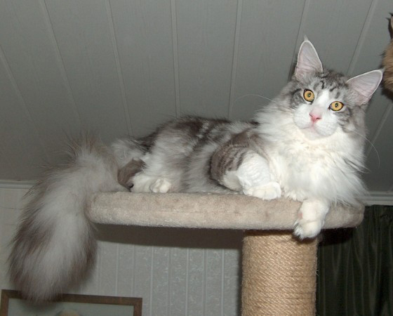 Bei unserem ersten Besuch bei Frau Müller hat dieser Kater sofort unsere Aufmerksamkeit auf sich gezogen und unsere Herzen erobert. Er bestach durch seinen beeindruckenden Typ und präsentierte sich mit einem unwiderstehlichen Charme. Under Fire hat eine wunderschöne und ausgeprägte Schnauze mit einem dazu passenden Kinn. Er ist sehr groß und kräftig, steht auf sehr hohen Beinen , hat einen außergewöhnlich langen Schwanz sowie einen extrem langen Körper. Im Alter von 1,5 Jahren wog er bereits 8,3 kg.